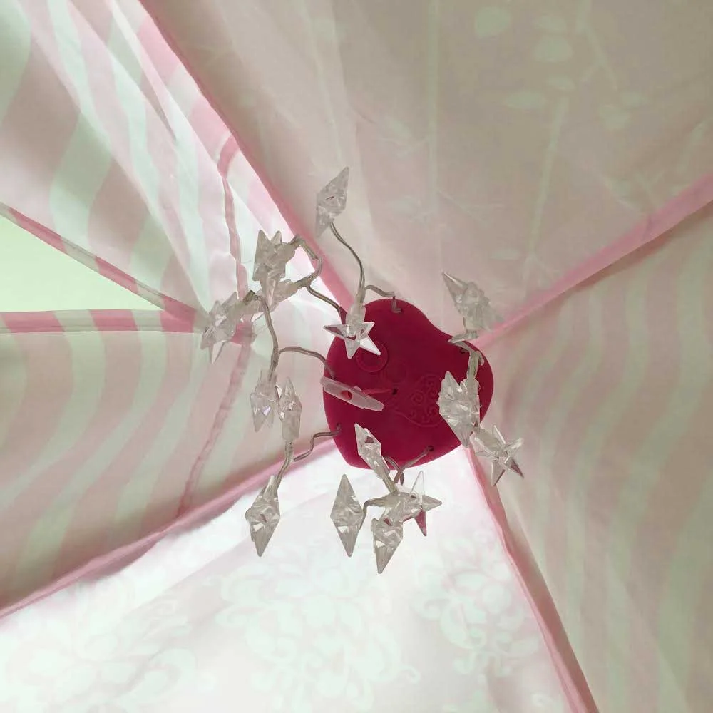 Our two-year-old daughter has a pink tepee tent in her room with a little lamp made of stars hanging on the inside. To turn on the lamp, you have to pull a pink string. Little E sees us turn it on, so now it’s her turn to try. She pulls and pulls with all her might until her little chubby cheeks start shaking.